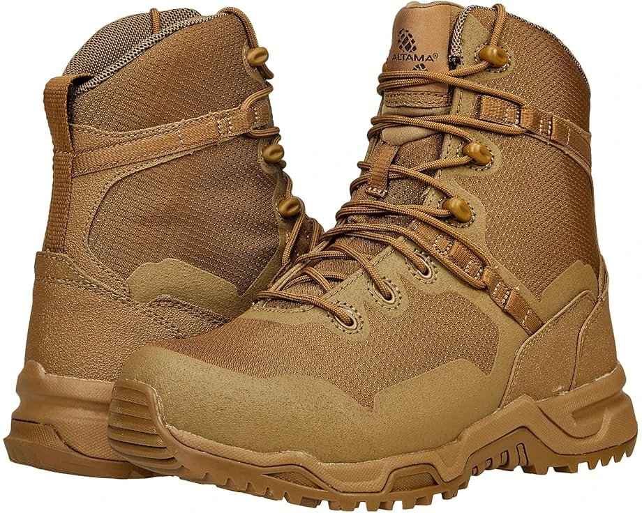 When agility matters, the Altama® Raptor 8″ Safety Toe is a high-performance, feather-light, mission-ready boot built with the comfort and flexibility of an athletic shoe combined with the stability, reliability, and functionality of an all-day, hardworking tactical boot. With the addition of a rugged steel toe cap, the Raptor is ready for every challenge. SKU: #9566172Advanced UFit lacing system ensures that the foot is properly positioned within the boot to eliminate rubbing and discomfort. This creates optimal ankle support and allows a custom fit.Quick drying air mesh fabric with no stitch construction to create flexibility. Steel safety toe meets ASTM F2413-18 I/75, C/75 and EH safety standards.Steel toe cap helps protect the foot from falling objects or compression.3mm rounded lace with increased strength and durability. Gusseted tongue helps to keep dirt and debris out.No stitch construction in forefoot area to create light weight flexibility.Lightweight molded dual density ethyl-vinyl acetate midsole with shock absorption zone for extra fatigue control.Custom-molded thermoplastic heel counter for instant comfort and protection. Jersey fabric Stationary Achilles Cushion pads and protects, while offering additional comfort and security.Durable microfiber polyurethane upper with abrasion resistant toe and mudguard.Ethyl-vinyl acetate midsole molded with a nylon shank for superior support.Alta-lite dual density blown rubber polyurethane insole for exceptional cushion and support. Style #322003 (Coyote).Slip-resistant rubber outsole exceeds ASTM F2913-19 for slip resistance.Imported.Product measurements were taken using size US Men’s 8.5, Women’s 10, width Medium. Please note that measurements may vary by size.Measurements: