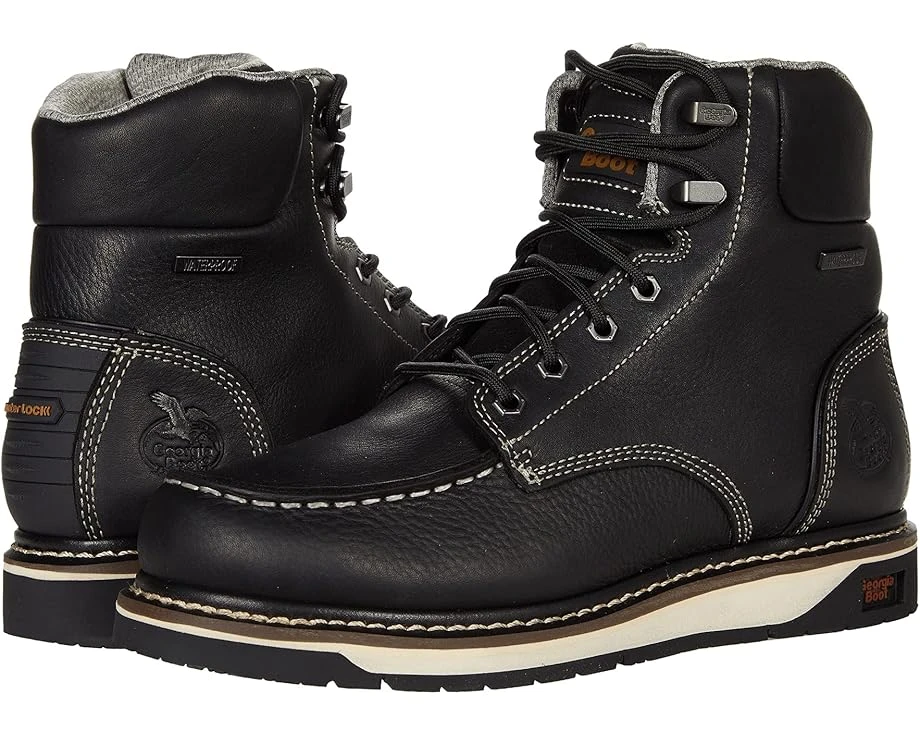 The Georgia Boot® Amp LT Wedge 6″ Soft toe boot with a Goodyear® welt constructed AMP LT waterproof wedge is extremely comfortable and designed for high performance.SKU: #9548602Soft toe meets ASTM F2892-18 EH (electrical hazard) safety standards.Full-grain leather upper.Branding on tongue and heel counter.Twin gore panels with larger opening for easy on-off access.Lace-up vamp.Round toe.EVA midsole.Goodyear® welt construction.High performance mesh lining.Removeable foam footbed.Slip resistant synthetic outsole meets ASTM F2913-19, ASTM F1677-05 Mark II standard.Oil Resistance meets ASTM D471-16a.Abrasion Resistance meets ASTM D1630-16.Melt Point meets ASTM D276-00 test.Imported.Product measurements were taken using size 9, width D – Medium. Please note that measurements may vary by size.Measurements: