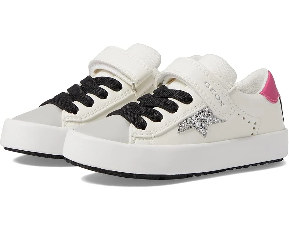 Step out stylishly wearing the uber-chic and athletic Geox® Kids Kilwi 170 Sneakers.SKU: #9892070Leather upper.Textile lining and insole.Hook-and-loop with elastic panel closure.Round toe.Glitter detailing on side panel.Brand logo on strap, insole, and heel cap.Synthetic outsole.Imported.Geox™ patented breathable shoe for active kids features a unique microporous membrane that absorbs and expels sweat while keeping water out.Product measurements were taken using size 24 (US 8 Toddler), width M. Please note that measurements may vary by size.Measurements:
