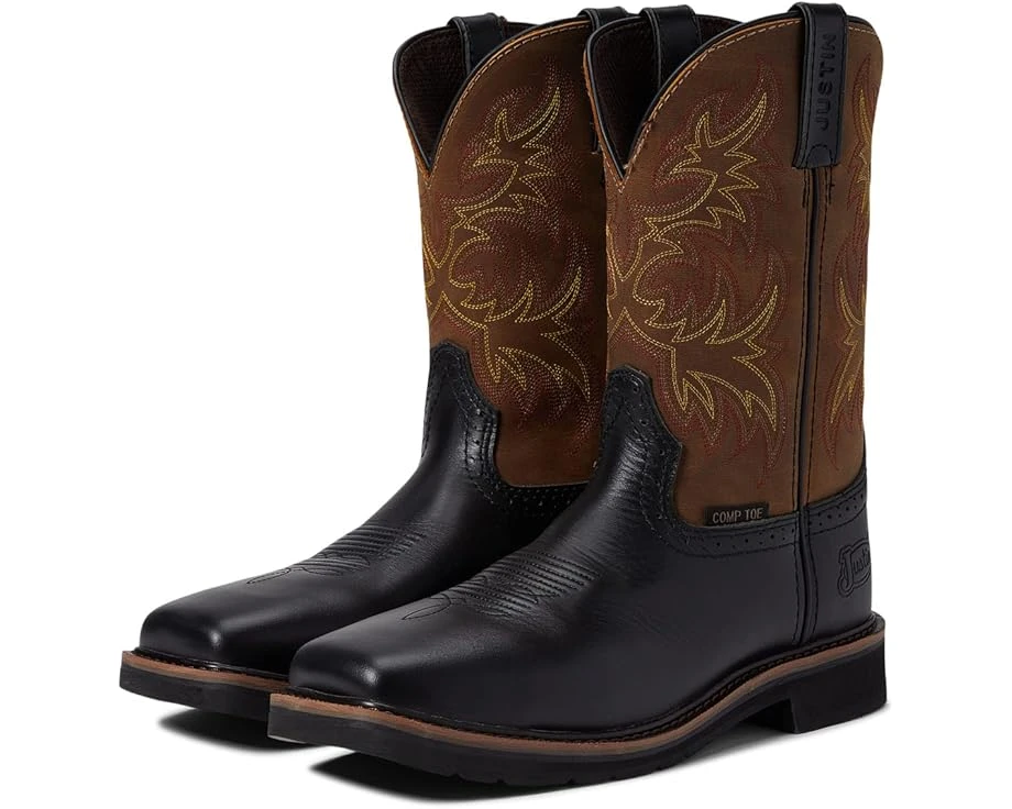 Please click here for information on heel slip.SKU: #9075444The Justin Driller Tan 11″ tall Men’s work boot brings comfort and durability to the job with rugged golden brown leather exterior embellished by a retro-themed pattern giving this boot a vintage feel.Soft toe meets ASTM F2892-11 standards for Electrical Hazard protection from open electrical currents up to 18,000 volts.This Justin® Driller Soft Toe work boot offers rugged durability and interior comfortable support to keep you working at your best all day long. Rugged leather upper. Rugged cowhide leather upper. Embellished with a retro-themed yellow, orange, and blue stitch pattern giving this boot a vintage feel.Stampede square toe for a spacious toe box. Pull-on boot with sturdy leather pull straps.Single stitch welt. Breathable mesh lining. Cushioned footbed with J-Flex Flexible Comfort System® ensures excellent support and cushioning for all-day comfort. Dual-density EVA midsole for added comfort. This boot has slip resistance that is Mark II tested.Stampede™ rubber and EVA combination outsole ensures resistance to abrasion, chips, slipping, and marking which allows you to comfortably work on any surface. Imported.Product measurements were taken using size 11, width EE – Wide. Please note that measurements may vary by size.Measurements: