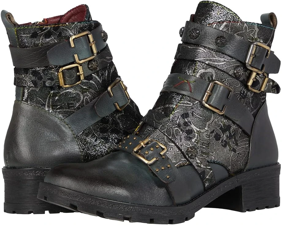 Please note that due to the unique hand-painted design of L’Artiste by Spring Step® footwear, the exact design may vary from piece to piece.SKU: #9573510The L’Artiste by Spring Step® Suzette, combat-style boots with studded and embroidered buckle straps, will give your everyday look a little edge while maintaining a feminine feel.Rear pull loop for entry assistance.Inside zip closure for easy on and off.Leather booties feature closed rounded toe and block heel.Textile lining and synthetic insole.Treaded rubber sole.Imported.Product measurements were taken using size EU 39 (US Women’s 8.5), width M. Please note that measurements may vary by size.Measurements: