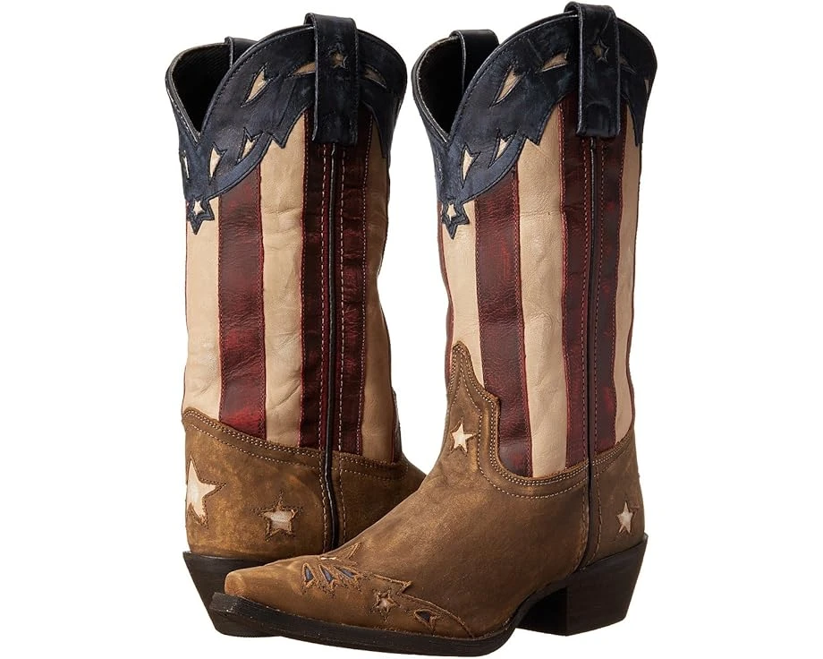 The Laredo™ Keyes boot is a sweet American look! SKU: #8543474Distressed leather upper with a vintage finish and featuring a beautiful stars-and stripes design.Features leather overlay with cutout design on vamp.Sturdy side pull tabs for easy entry.Smooth leather lining for a comfortable next-to-skin feel.Cushioned leather footbed.Snip toe.Medium cowboy heel.Durable leather outsole provides excellent stability and traction. Imported.Product measurements were taken using size 7.5, width B – Medium. Please note that measurements may vary by size.Weight of footwear is based on a single item, not a pair.Measurements: