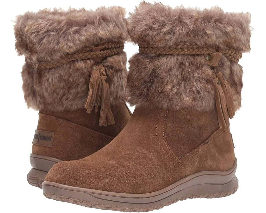 Paired with denim and a warm and cozy sweater, the water repellent Minnetonka® Everett winter boot will get attention with every turn. Crafted from a soft suede and featuring cascading faux fur accented by a braided suede tie. SKU: #9263510Easy pull-on design.Removable insole for all-day comfort.Durable rubber outsole.Imported.Product measurements were taken using size 9, width M. Please note that measurements may vary by size.Measurements: