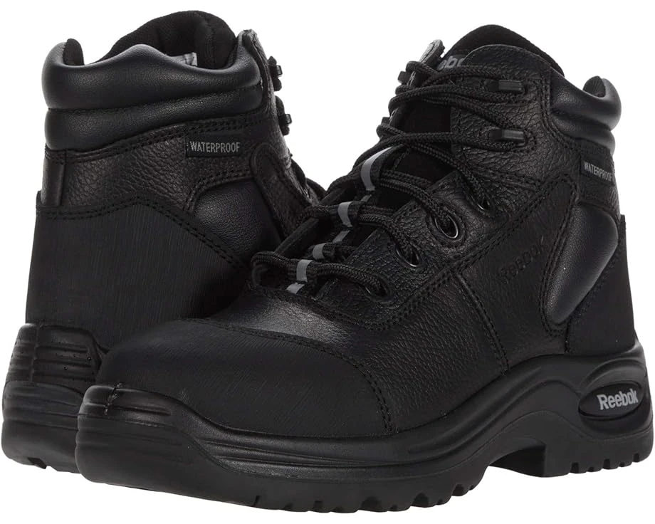 Protect yourself on hazardous job sites with the supportive cushioning, impact protection, and puncture resistance of the Reebok® Work Trainex work boots.SKU: #9466093CSA green triangle patch-rated for impact protection and puncture-resistant midsole.Metal-free, comp-toe work boots in a sport-inspired design that meets ASTM F2413 I/C (Impact and Compression), EH (Electrical Hazard) safety standards.Leather uppers with waterproof membrane and moisture-wicking, nylon mesh lining.Abrasion-resistant heel and toe guards.Cushioned collar and tongue with lace-up closure.EVA cushion removable footbed with sponge rubber heel wedge for supportive comfort.Polyurethane cushion midsole and airbag in heel.Aircom™ Air Comfort Technology for lasting breathability. Direct attached Athlite traction rubber outsole with 90° heel for durable wear and reliable traction.Slip resistant outsole meets and exceeds MARK II Standard of .44 oily/wet.Imported.Product measurements were taken using size 9, width B – Medium. Please note that measurements may vary by size.Weight of footwear is based on a single item, not a pair.Measurements: