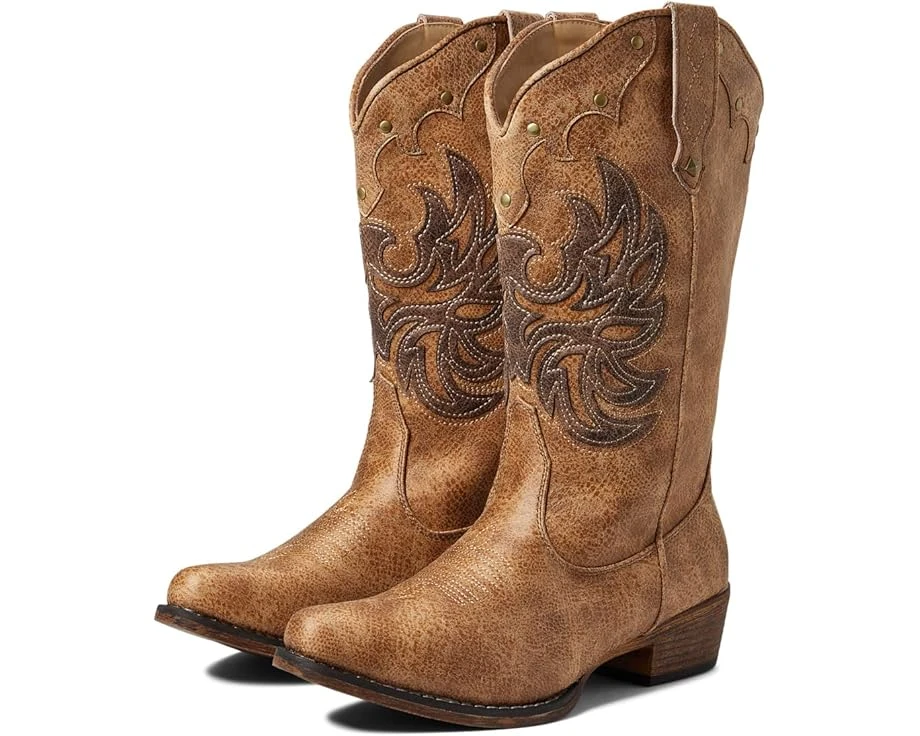 Take out your inner diva wearing the evergreen Roper® Amelia Tall Boots. SKU: #9786673Leather upper. Man-made lining and insole. Pull-on style. Pull loops for easy wear and removal. V-dip on the collar. Shaft with an eagle overlay for added style. Square toe and block heel. Stitching detail on the vamp. Allover stud detail for a vintage vibe. Man-made outsole. Imported. Measurements: