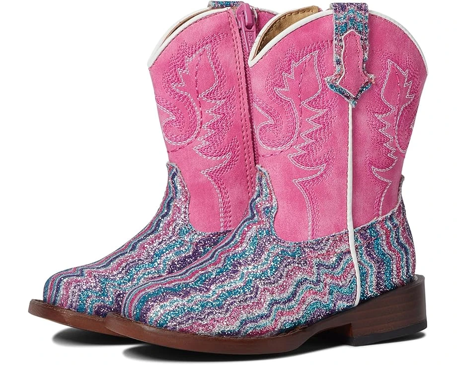 Complement your little one’s style by adding the Roper® Glitter Waves boots to their ensemble.SKU: #9787541Man-made upper, lining, and insole.Zippered side closure.Square toe.Stacked block heel.Appliqued detail with glittered and wavy design.Pull tab on the collar.Man-made outsole.Imported.Product measurements were taken using size 5 Toddler, width M. Please note that measurements may vary by size.Weight of footwear is based on a single item, not a pair.Measurements: